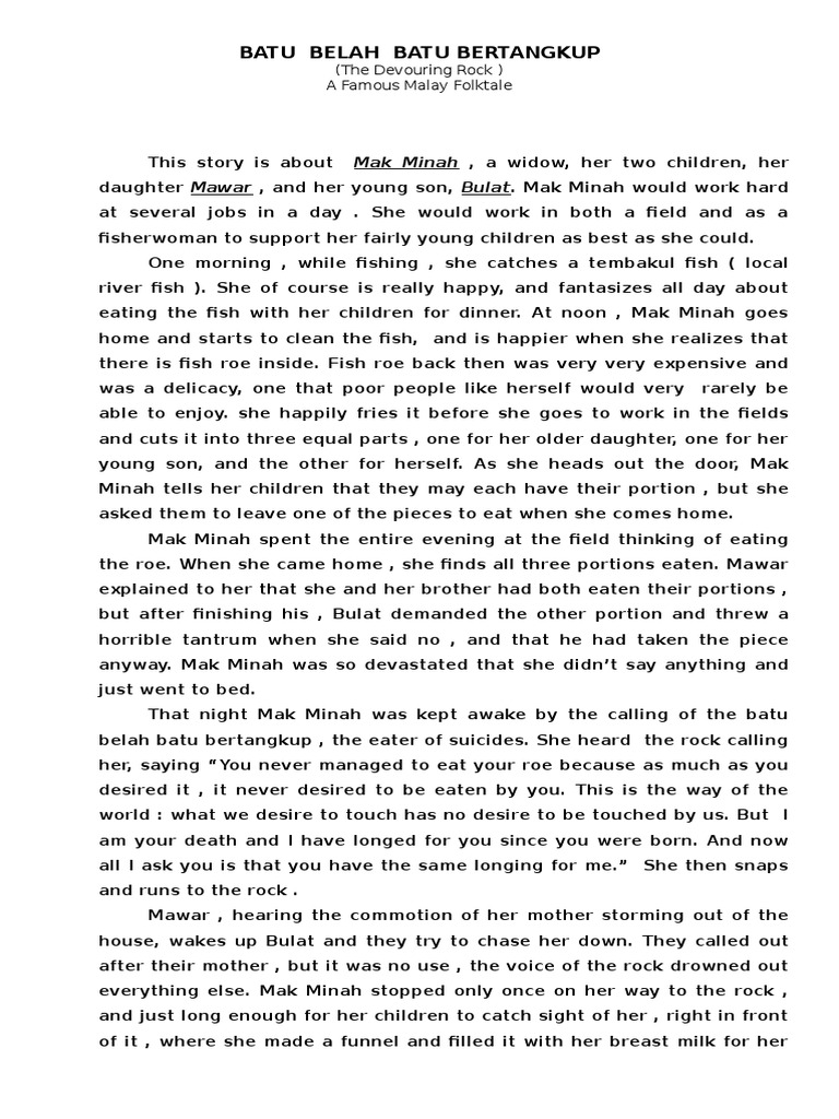 Don't be super selfish, don't always think. Dalam penulisannya tentu saja sudah mengalami tahap penyuntingan, baik dari segi diksi, gaya bahasa. Cerita masa kecil yang selalu menguras air mata ketika diceritakan kembali,sampai hari ini. Cerita rakyat ini dikembangkan oleh para informan. Gua ini digelar batu bellah batu betangkup dan amat ditakuti oleh ramai penduduk kampong.