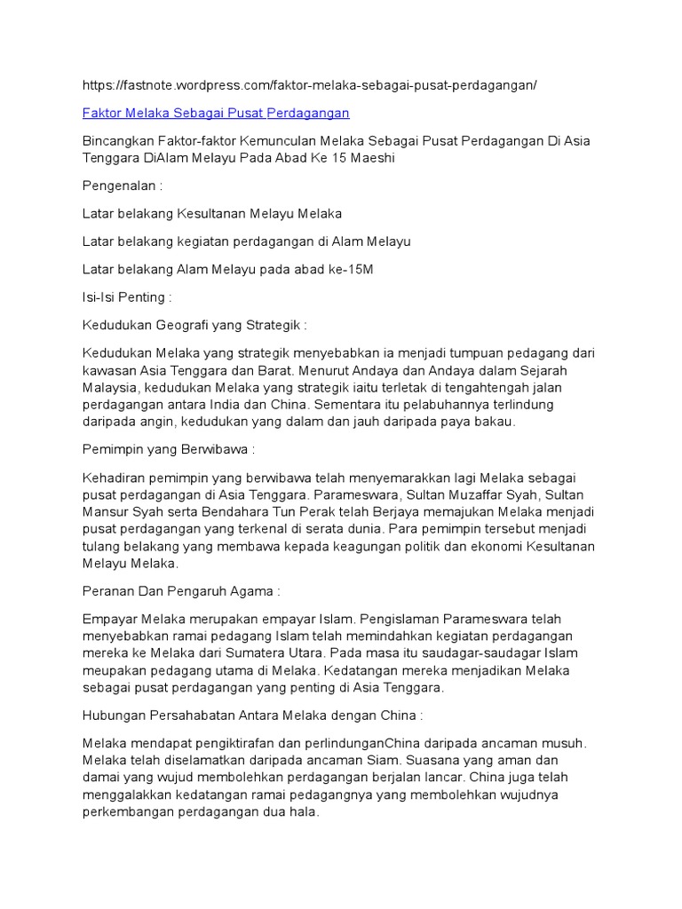 Faktor Melaka Sebagai Pusat Perdagangan - Apabila melaka bangkit sebagai pusat perdagangan, para pedagang islam dari arab, parsi dan india turut berdagang di melaka.. Anda bisa melakukan perdagangan lintas negara untuk memasarkan prooduk anda. Melaka pernah berada pada satu tahap yang membanggakan dan dikenali di seluruh dunia. Pusat perdangangan ini adalah sebahagian daripada kawasan hang tuah jaya. Apabila melaka bangkit sebagai pusat perdagangan, para pedagang islam dari arab, parsi dan india turut berdagang di melaka. Karena pelabuhan malaka dilewati oleh banyak pedagang, sehingga para pedagang arab yang sebagian besar beragama islam sambil berdagang, mereka juga menyebarkan agama islam, bisa dengan perkawinan dengan anak saudagar atau pun dengan.